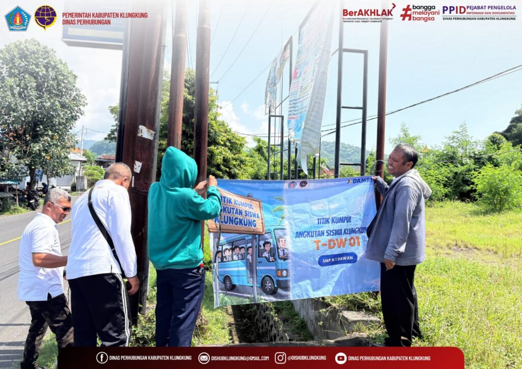 Semarapura, 2 Januari 2026 – Dinas Perhubungan Kabupaten Klungkung melalui Bidang Angkutan dan Sarana melaksanakan kegiatan pemasangan spanduk titik kumpul Angkutan Siswa Gratis (Angsis) untuk jenjang Sekolah Menengah Pertama (SMP) di wilayah Kecamatan Dawan. Kegiatan ini merupakan bagian dari tahapan persiapan menjelang dimulainya operasional layanan Angkutan Siswa Gratis bagi siswa SMP di Kecamatan Dawan.