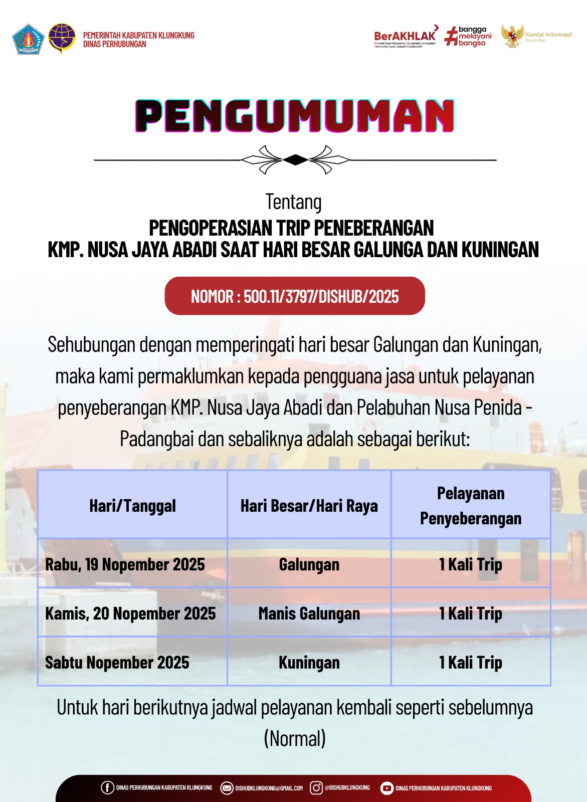 Dalam rangka memperingati Hari Besar Galungan dan Kuningan, Dinas Perhubungan Kabupaten Klungkung menyampaikan informasi kepada seluruh pengguna jasa mengenai penyesuaian jadwal operasional penyeberangan KMP. Nusa Jaya Abadi pada lintasan Nusa Penida – Padangbai dan sebaliknya.