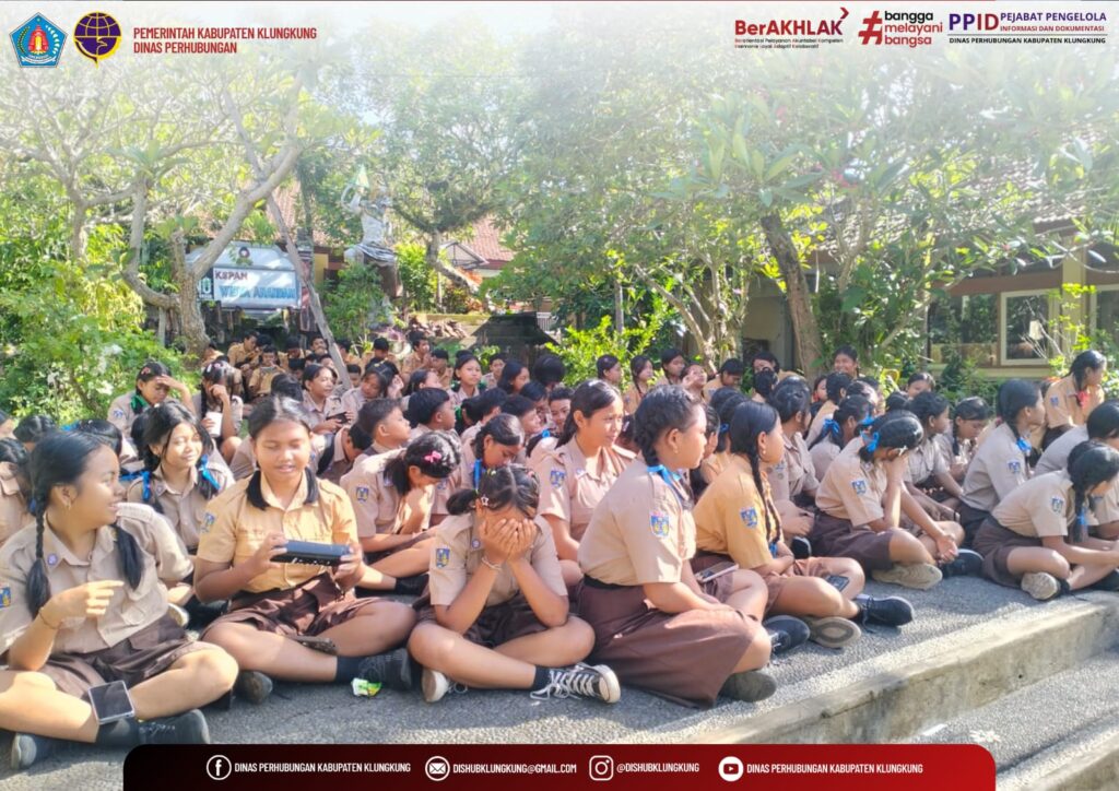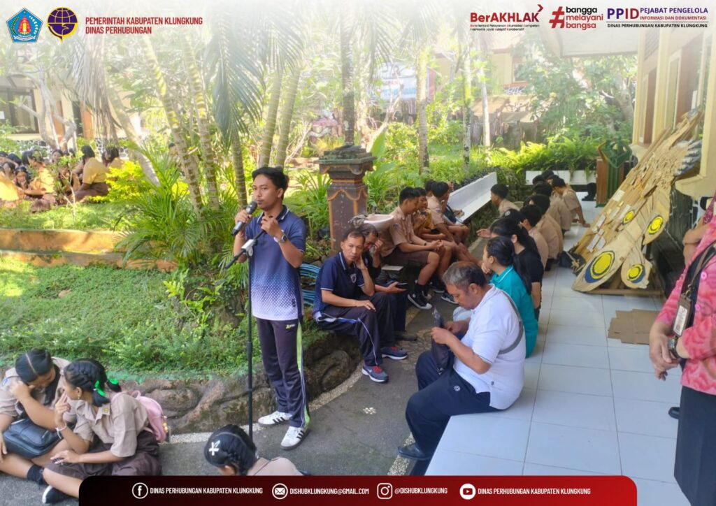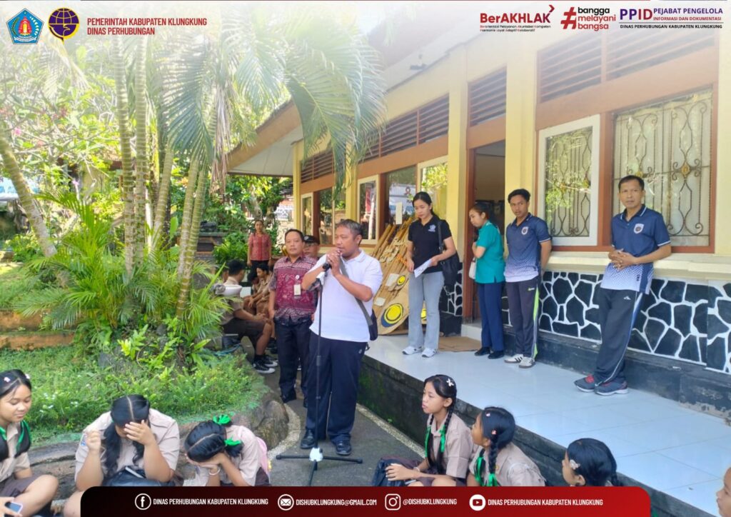 Sementara itu, dari Bidang Pengembangan Keselamatan Dinas Perhubungan Kabupaten Klungkung, staf Gede Anom dan Eliza menyampaikan materi yang menekankan pada aspek keselamatan berlalu lintas. Materi tersebut meliputi pentingnya disiplin selama perjalanan, kepatuhan terhadap arahan pramudi, serta perilaku aman dan tertib saat naik dan turun dari kendaraan Angkutan Siswa Gratis.